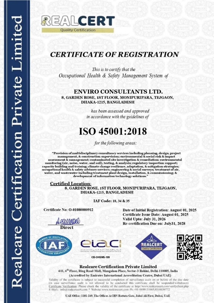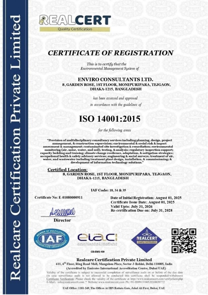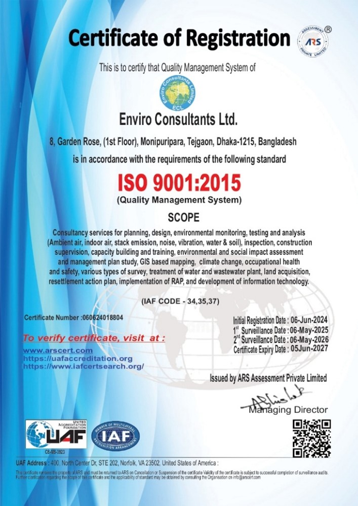 ECL conducted more than fifty Initial Environment Examination (IEE), Environmental Impact Assessment (EIA), Environmental Management Plan (EMP), Environmental and Social Impact Assessment (ESIA), Environmental and Social Management Action Plan (ESMAP), Environmental and Social Duie Diligence (ESDD), Ensure compliance and Clearance for SCC and ECC from DoE, Construction Environmental Management Plan (CEMP), Risk Assessment and Management, Climate Change and Resilience, Methane Reduction, Net zero carbon, 3R, Circular economy, Environment and Social Commitment Plan (ESCP), Labour Management Plan (LMP), Gender Action Plan (GAP), SH-SEA, Land Acquisition Plan (LAP), Resettlement Action Plan (RAP), Implementation of RAP, etc., in different Infrastructure (Roads, Bridges, Culvert), Industries, University, High Rise Building, Power Sector, Textile (Dyeing, Printing and Weaving), Pharmaceutical, Sugar, Oil, Gas & Energy, Fertilizer, Cement, Pulp & Paper, Iron & Steel, Ceramic, Food Industry, Tannery & Leather, Chemical Industries, etc.
